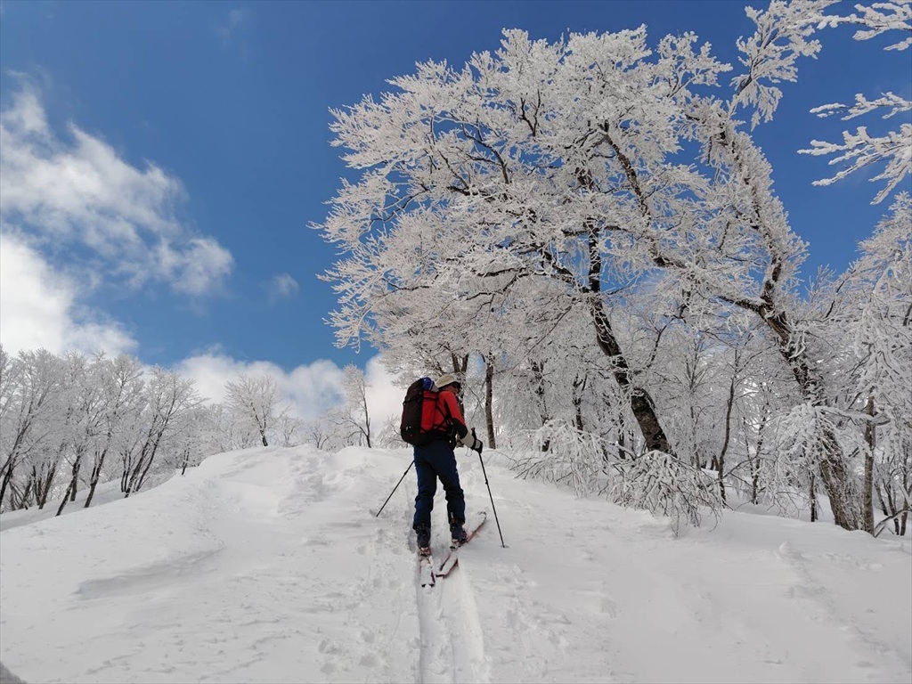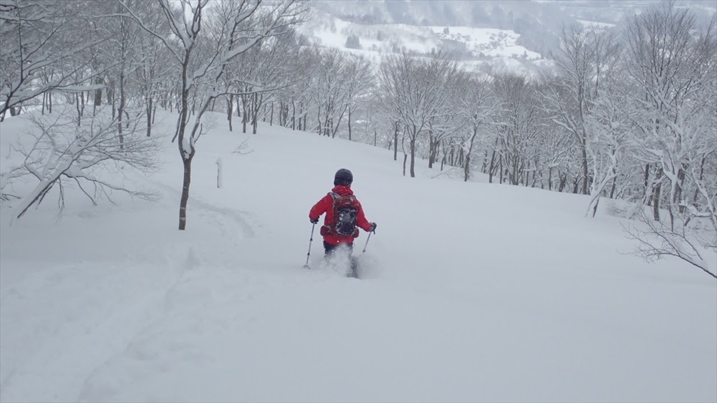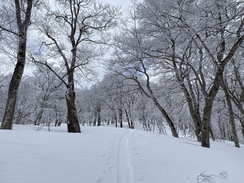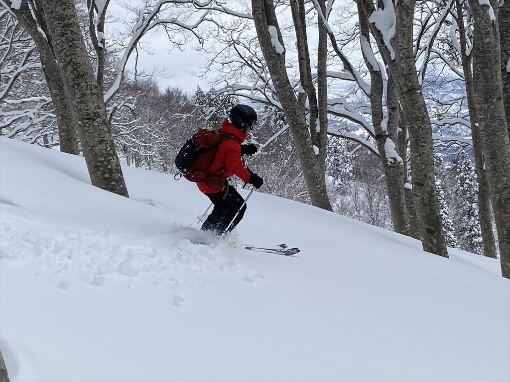 二日目はメインルートの尾根のトレースを登高して、誰も滑らない尾根を快適に滑り降りた、平均斜度20度前後が道路まで続く素晴らしいルート。