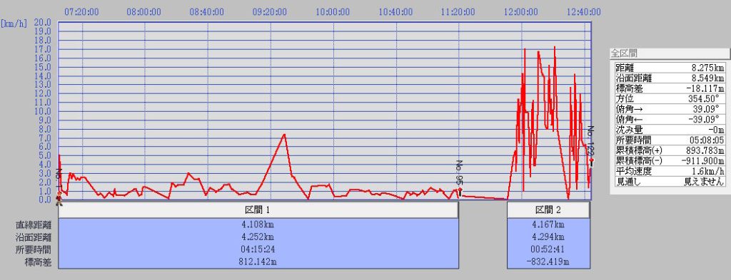 今回の山行の「速度/時刻グラフ」