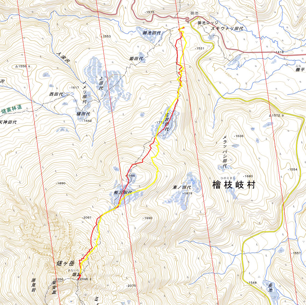 トラックログ(赤:登り、黄:下り)