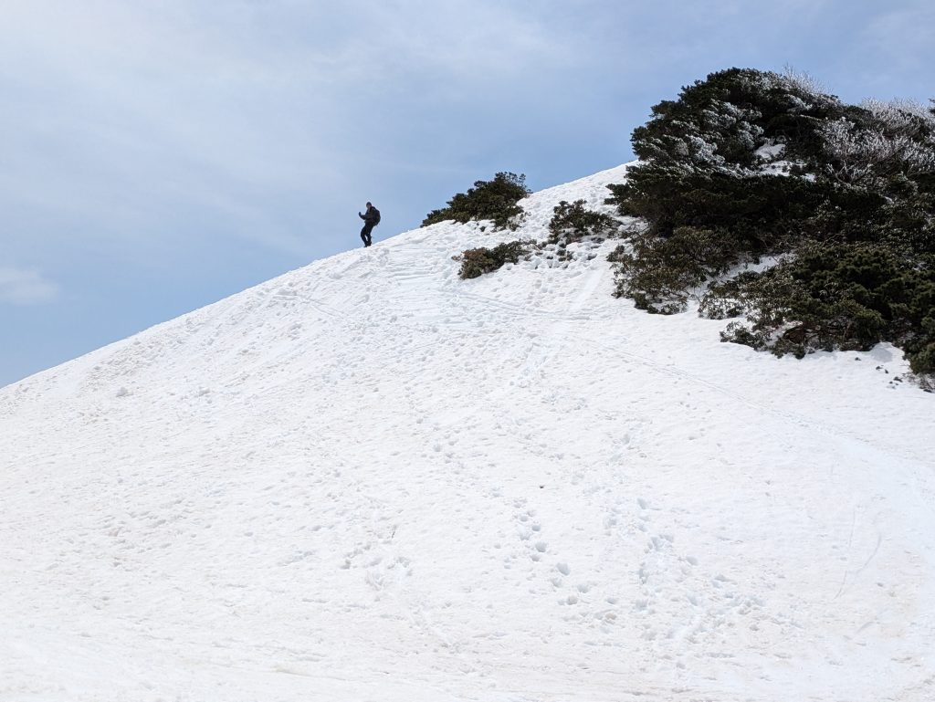 急な登り一段落、まだ上まで雪はつながっていますが、その上は傾斜がさらに急で、無理して山頂までスキーで行くことないので、標高差20mですが、板をデポ。
