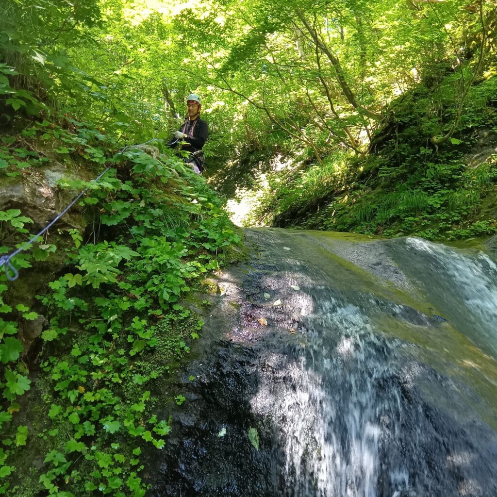 バリケードすぐ先の橋を渡った先、車道が沢を離れる地点で入渓するとすぐにナメ床が現れる。晴天続きのため水量は少なくやや滑りやすい印象だが、陽射しを浴びて気持ちよく進むと意外に早く10mナメ滝が現れる。今回で3回目の古川さん、過去2回はここでロープをフィックスして皆でトライしたらしいが今回はあっさりパス、左岸のルンゼに入り落口に向かって小さく巻く。