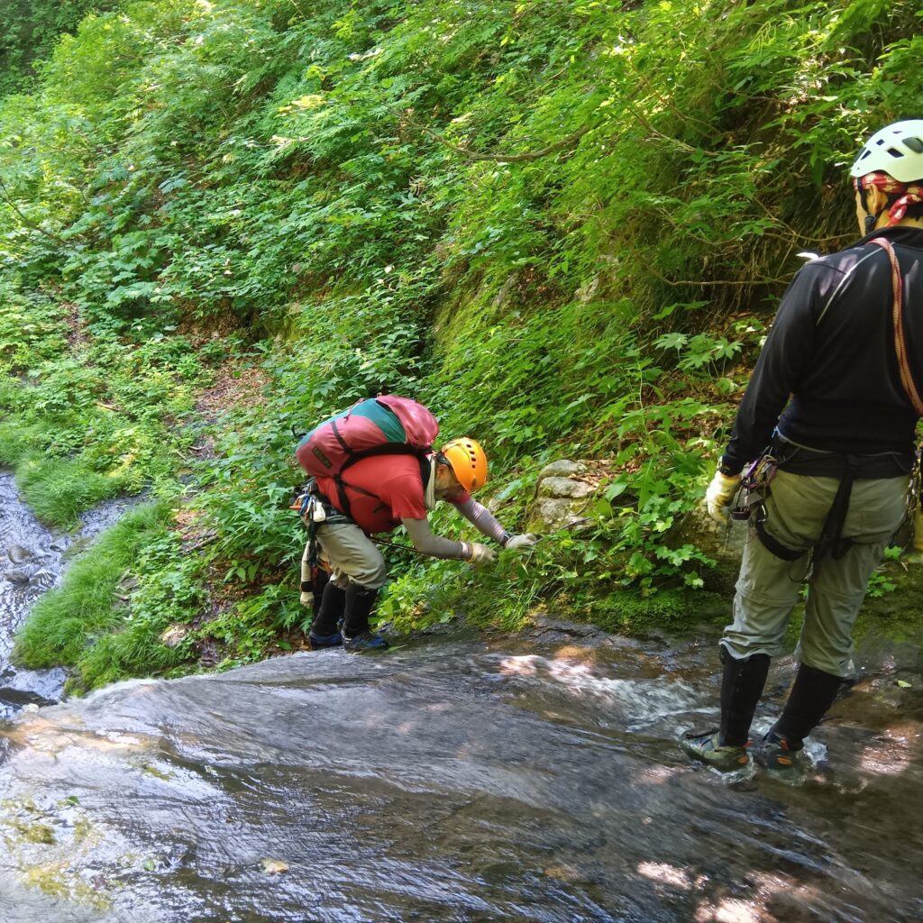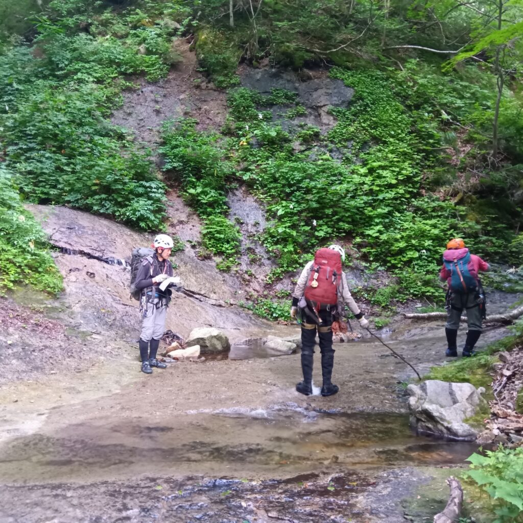 緩やかなナメ床が続いて明日の下降路である南沢を右岸に迎えた後、ナメ滝が幾つも現れその中の一つでは行方さんが先行してロープフィックスする。