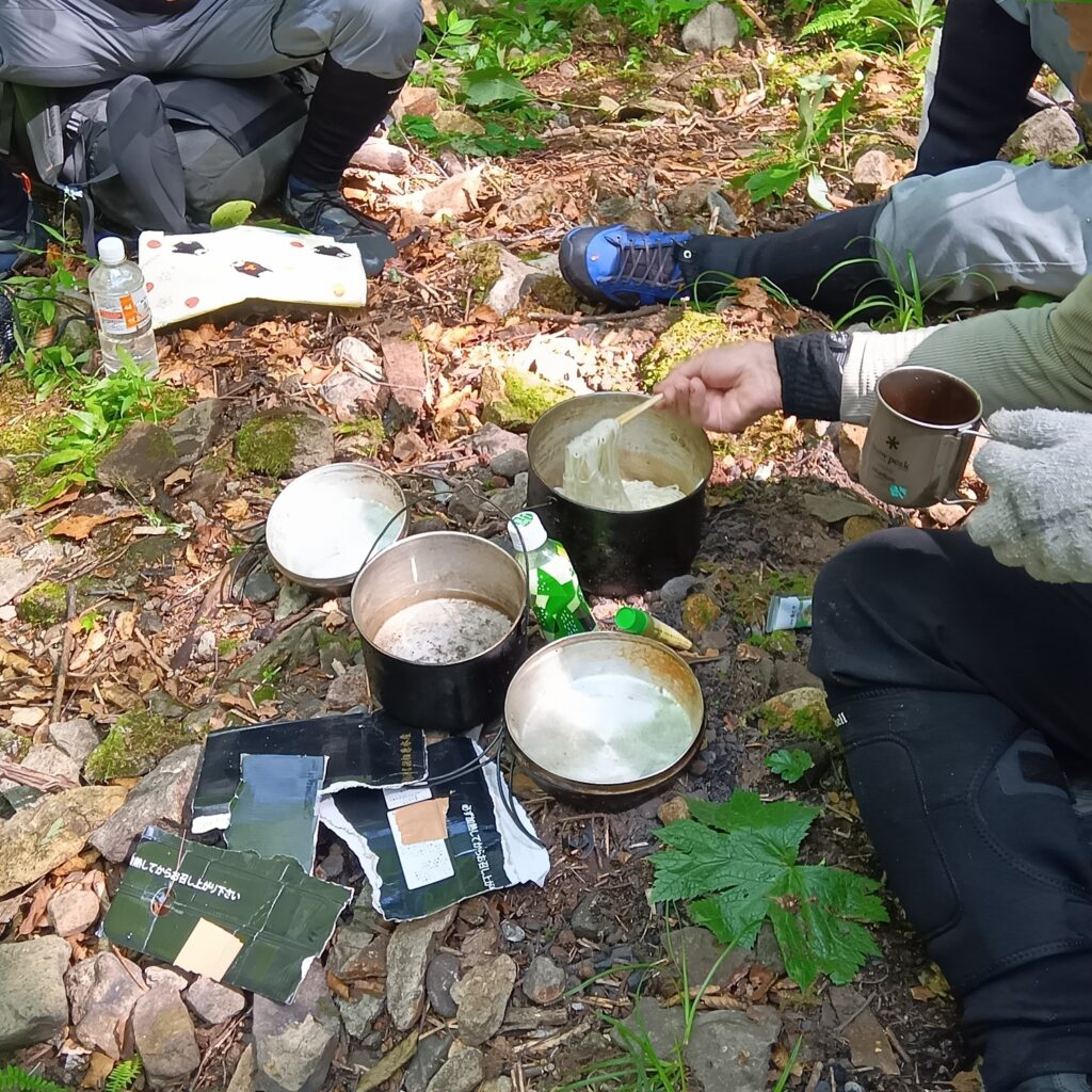 踏み跡はすぐ先で不明瞭となるが藪をかきわけ尾根状を北北東に暫く進み、仙台市と川崎町の境界線が尾根から離れる辺りで進行方向を東に変えて境界線と平行に急斜面を川崎町に入らないように下っていく。小さな岩峰を過ぎた標高1200mくらいで小さな沢型に踏み跡を再発見すると再び北北東に向きを変え、いまいち判然としない沢型をひたすら下る。水流がなかなか現れず踏み跡頼みの下りを続けるが900m二俣辺りからようやく沢らしくなりナメも現れ快適になる。下りでも菅野さんのペースは回復せず、この辺りで他の3人に荷物を少し移す。