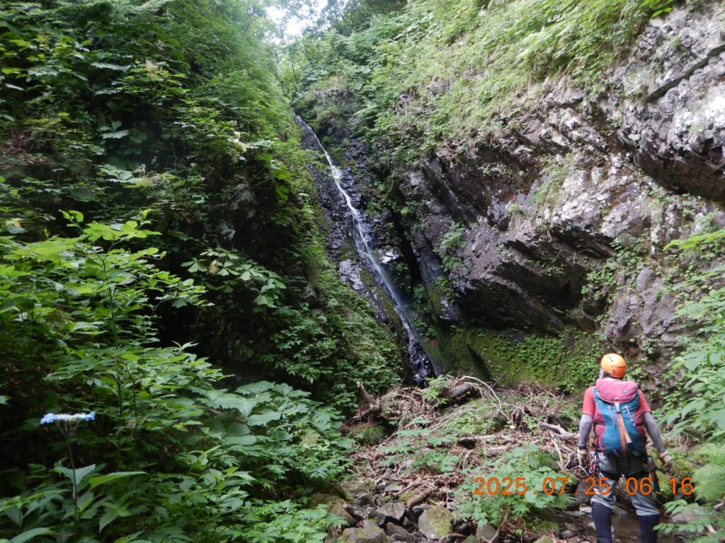 7月25日(金) 天候 晴れ:天場5:50~小松原沢出合6:05~15m斜滝下6:20~15m斜滝上7:20~仙台神室岳9:35/9:50~1200m沢型10:35/10:45~900m二俣12:10/12:30~南沢出合13:33~駐車場14:23